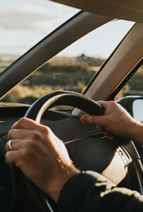 Hand holding steering wheel in a Car